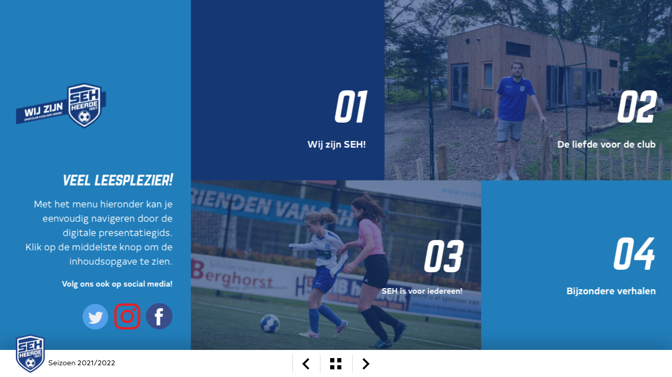 Uiteraard is de inhoud ook anders dan een ‘traditionele’ pr-gids, al zullen enkele onderdelen ook in deze online presentatie te vinden zijn. Bijvoorbeeld alle mogelijkheden die er zijn om te voetballen bij SEH. Daarnaast is er veel aandacht voor ons vlaggenschip, het eerste elftal. Maar je komt ook zeker nieuwe, verrassende en originele verhalen tegen over onze sporters, vrijwilligers en sponsoren.